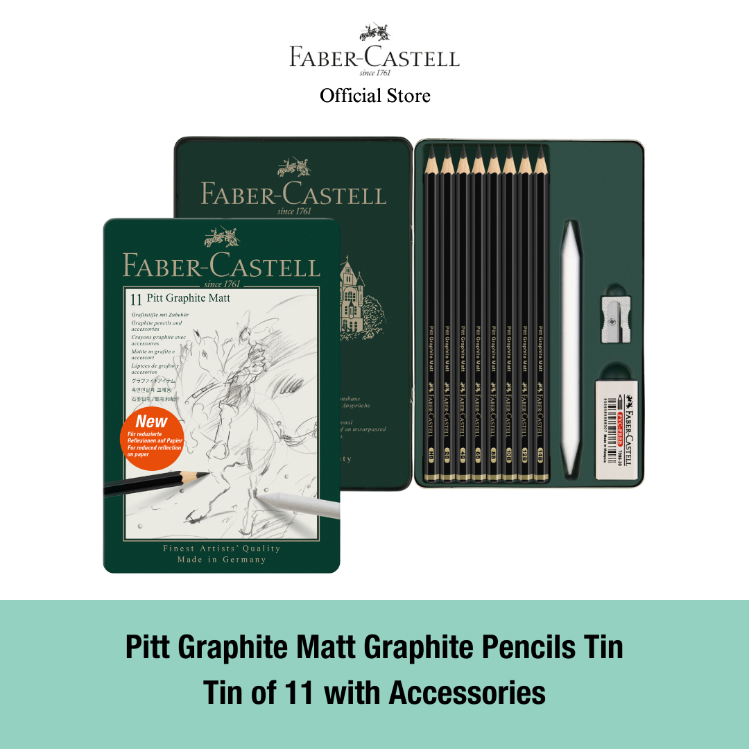 - Tin of 11 Contains: HB, 2B, 4B, 6B, 8B, 10B, 12B, 14B, 1x Blending Stump, 1x PVC-Free Eraser, 1x Metal One-Hole Sharpener